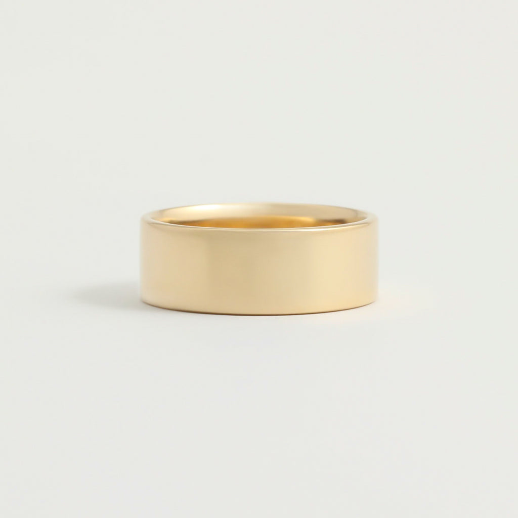 The warm tones of Yellow Gold are a classic finish for a wedding band. This ring is 7mm wide and 1.3mm thick with a flat outside and lightly curved inside, so it’s super comfy.
