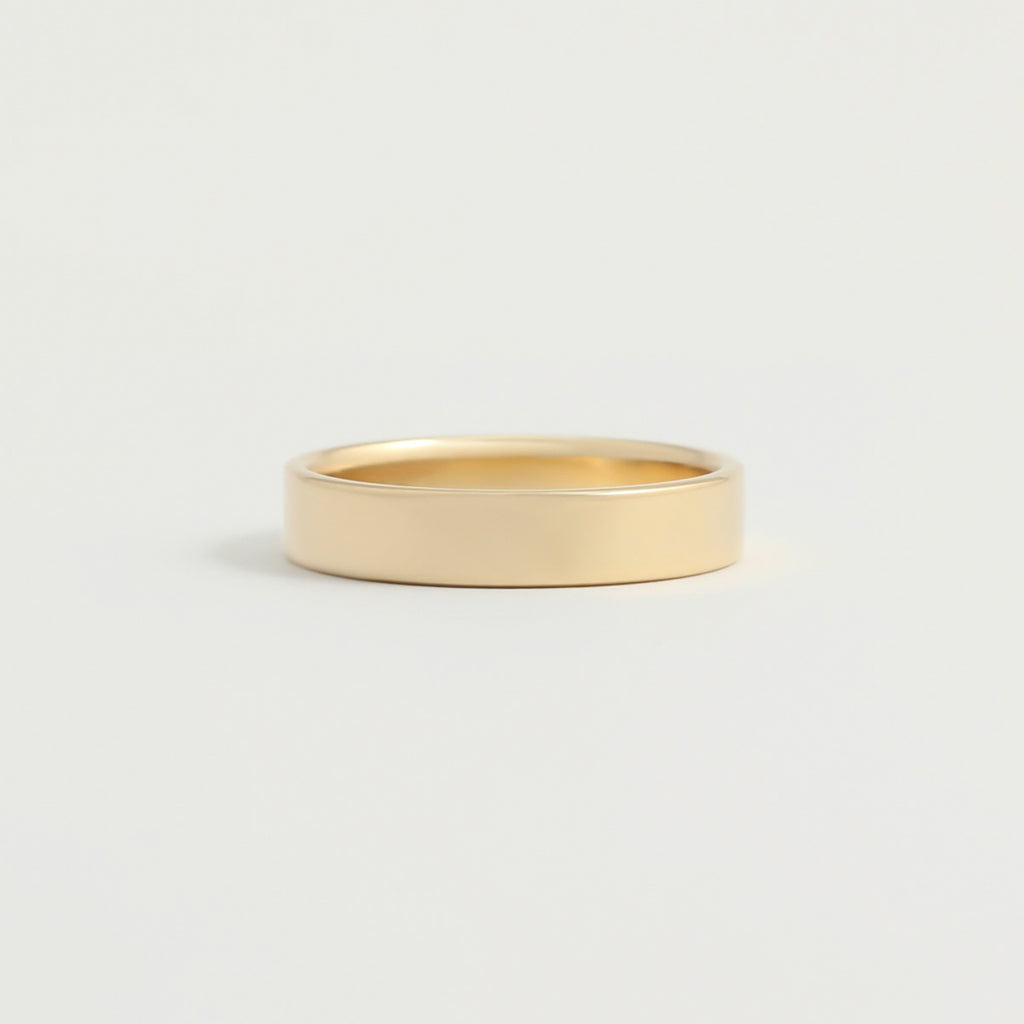 This ring is 4mm wide and 1.3mm thick with a flat outside and lightly curved inside, so it’s super comfy.